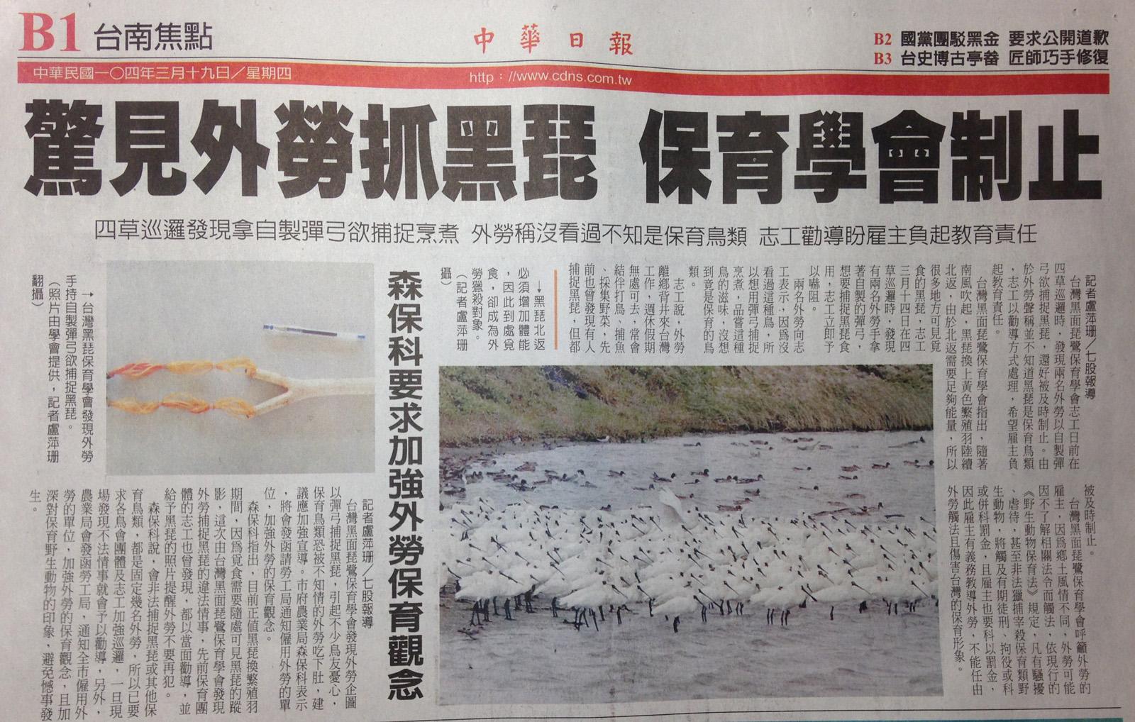 【2015/3/19】驚見外勞抓黑琵 保育學會制止